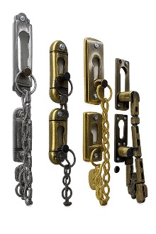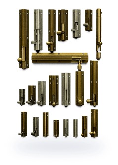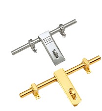 A tower bolt made from brass or aluminium is a simple sliding bolt used to secure doors and windows. It features a rod that slides into a socket to lock the door from one side.